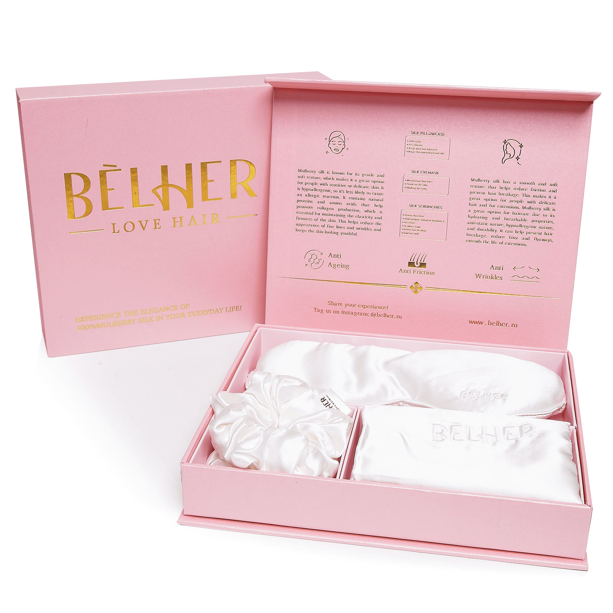 Setul cadou pentru dormit este alcatuit din matase 100% naturala Mulberry, de cea mai inalta calitate, fiind o alegere excelenta pentru un somn odihnitor si de calitate.