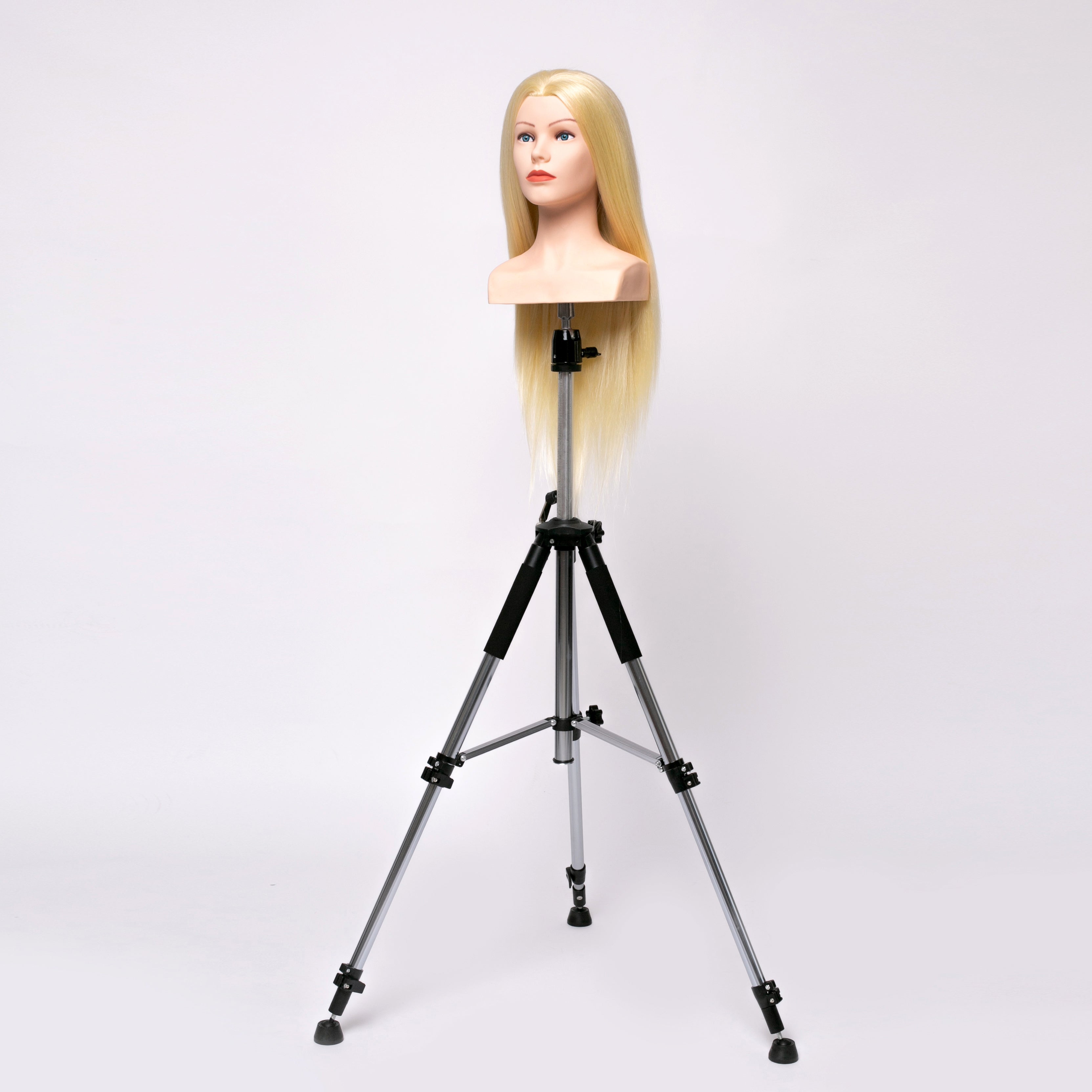 Cap manechin pentru coafor cu par fibra sintetica blond platinat, cu o textura moale si matasoasa, perfect pentru a exersa tunsori si coafuri.