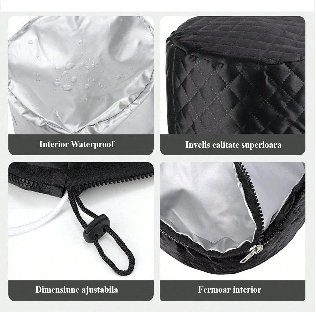 Interiorul impermeabil pastreaza caldura uniform, favorizand deschiderea cuticulei firului de par pentru o absorbtie optima a nutrientilor. Invelisul exterior din material de calitate superioara asigura durabilitate si mentine temperatura constanta pe toata durata tratamentului.