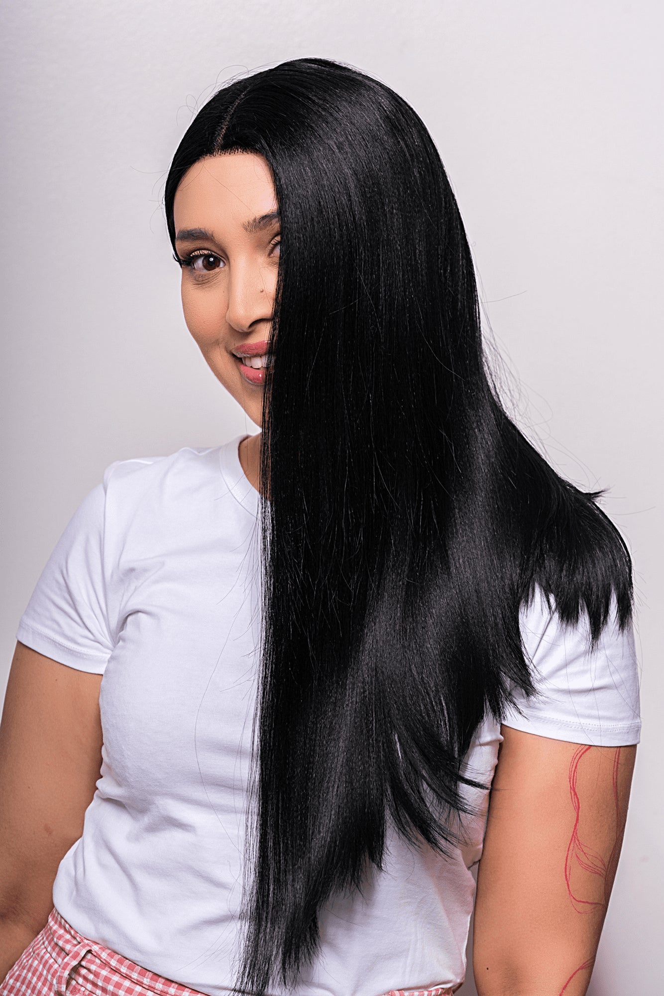 Asezati peruca in functie de plantatia parului dumneavoastra. Daca nu o simtiti sigura, reglati peruca cu ajutorul bretelelor elastice din interior.